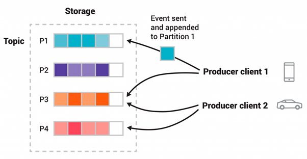 Figure: This example topic has four partitions P1–P4. Two different producer clients are publishing, independently from each other, new events to the topic by writing events over the network to the topic’s partitions. Events with the same key (denoted by their color in the figure) are written to the same partition. Note that both producers can write to the same partition if appropriate.